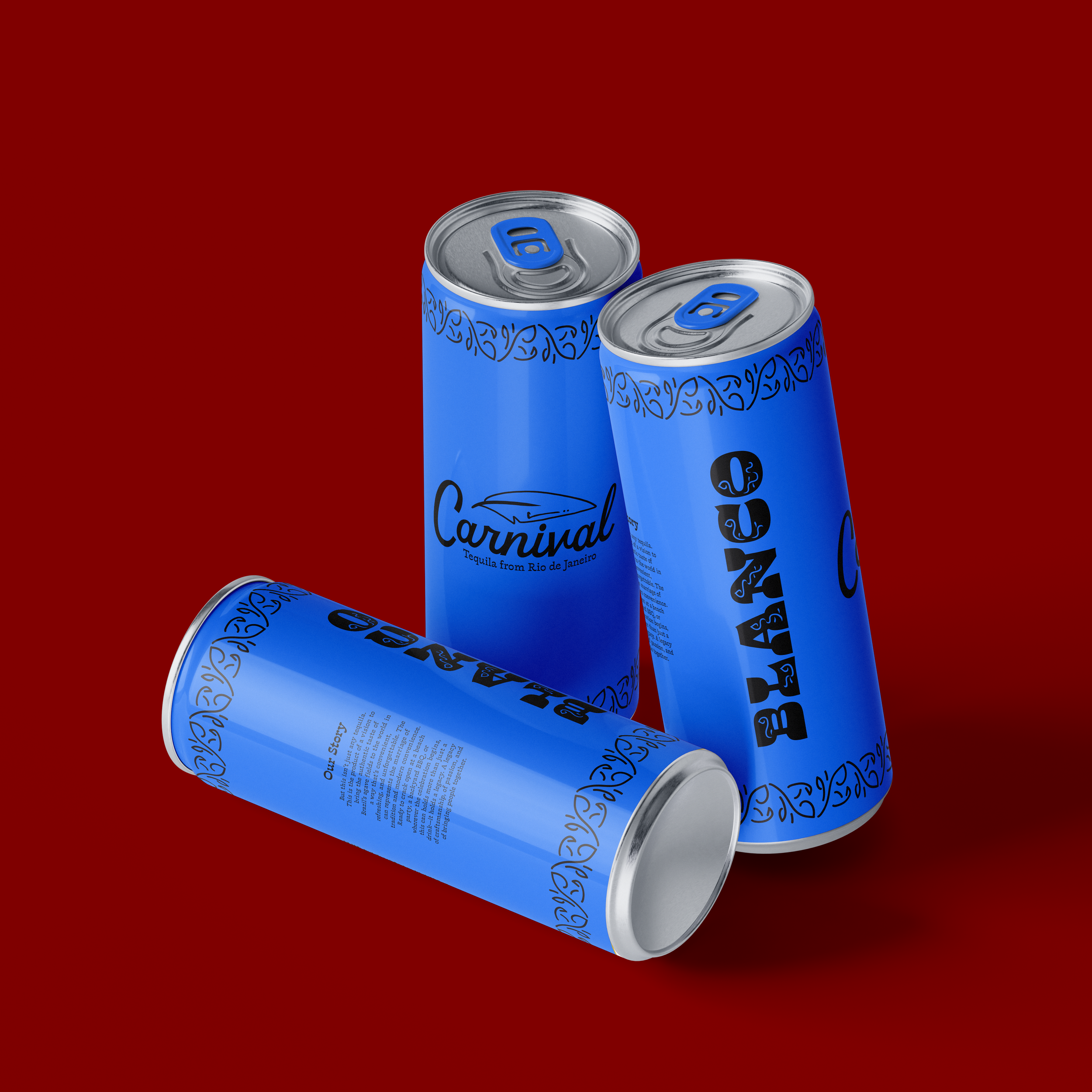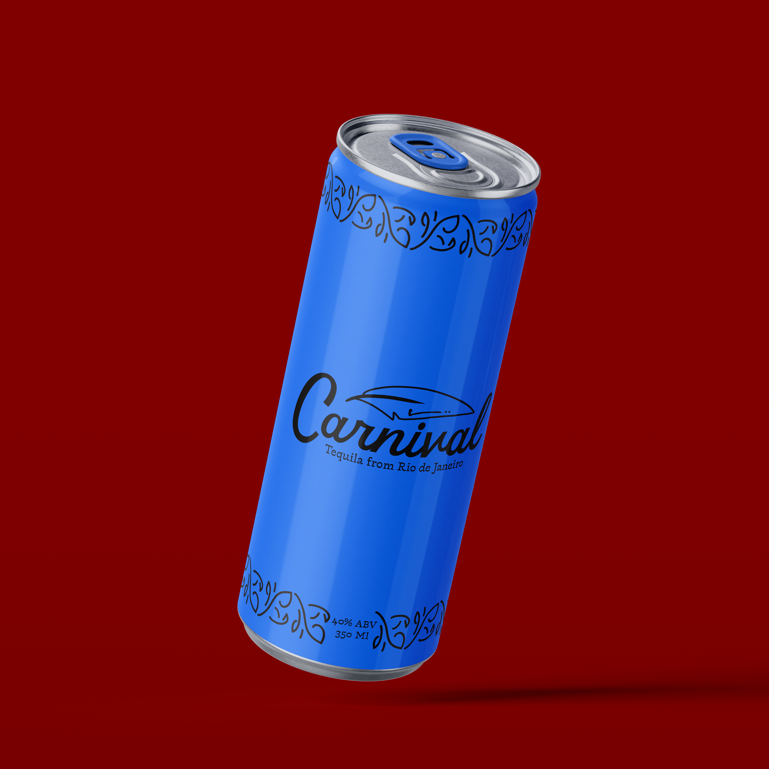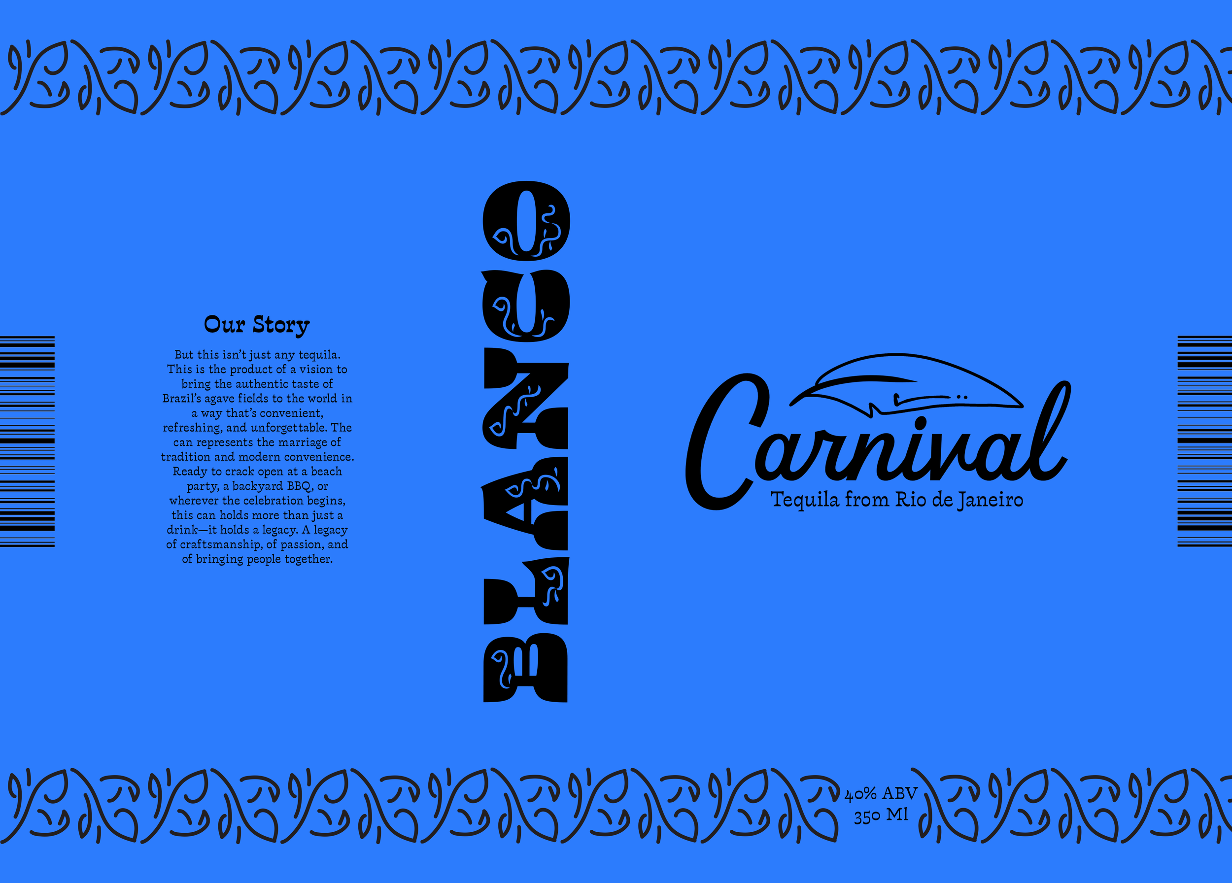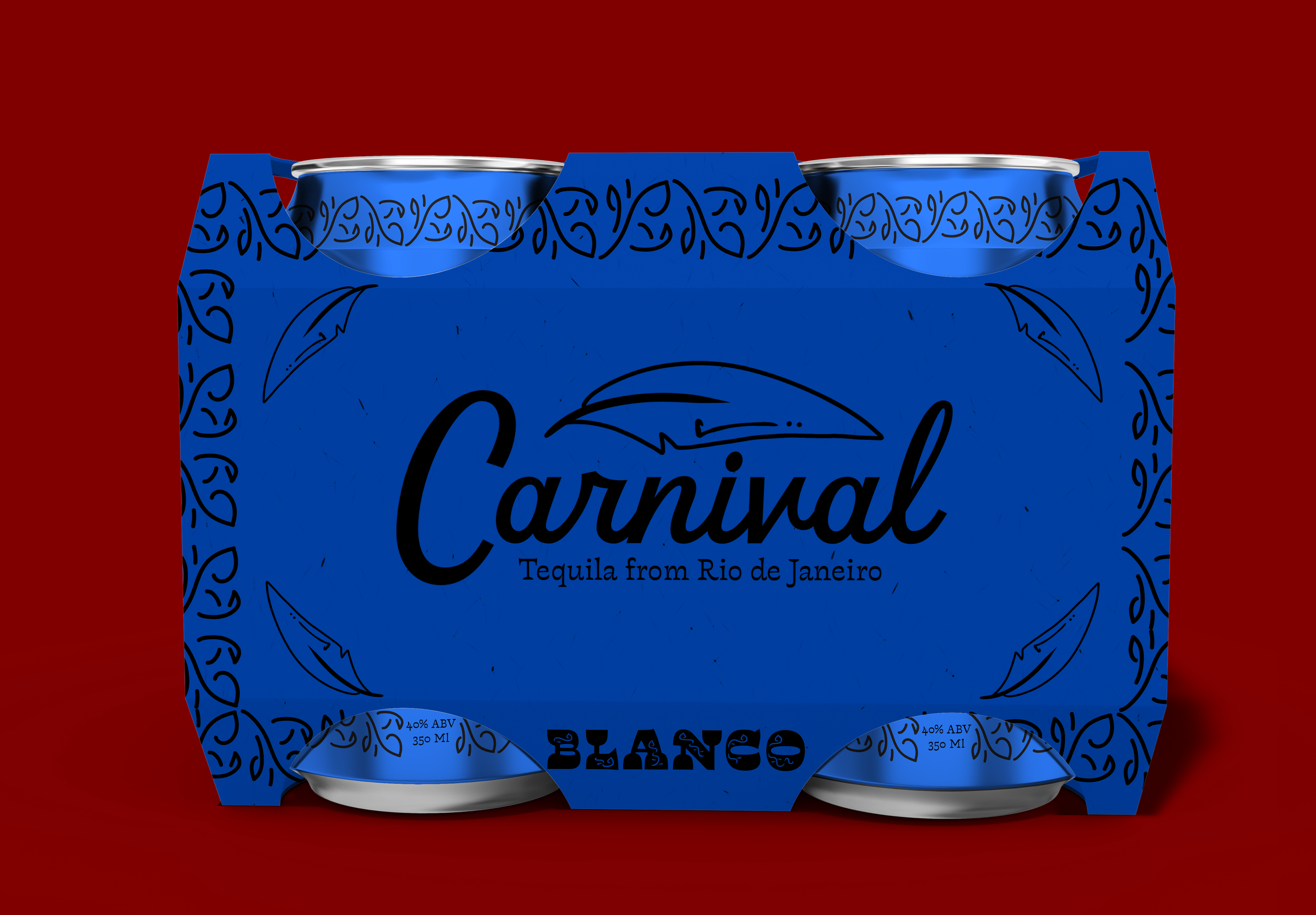 Carnival is a canned tequila brand focused on the aesthetic of the Brazilian festival Carnaval. The colors of the brand are inspired by the blue macaw, and the patterning takes inspiration from the typeface Violeta Jardinera.