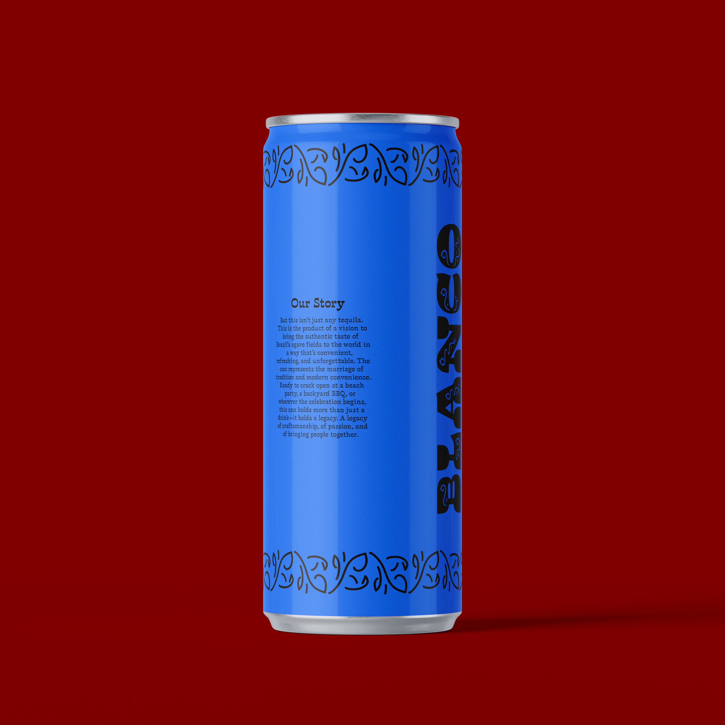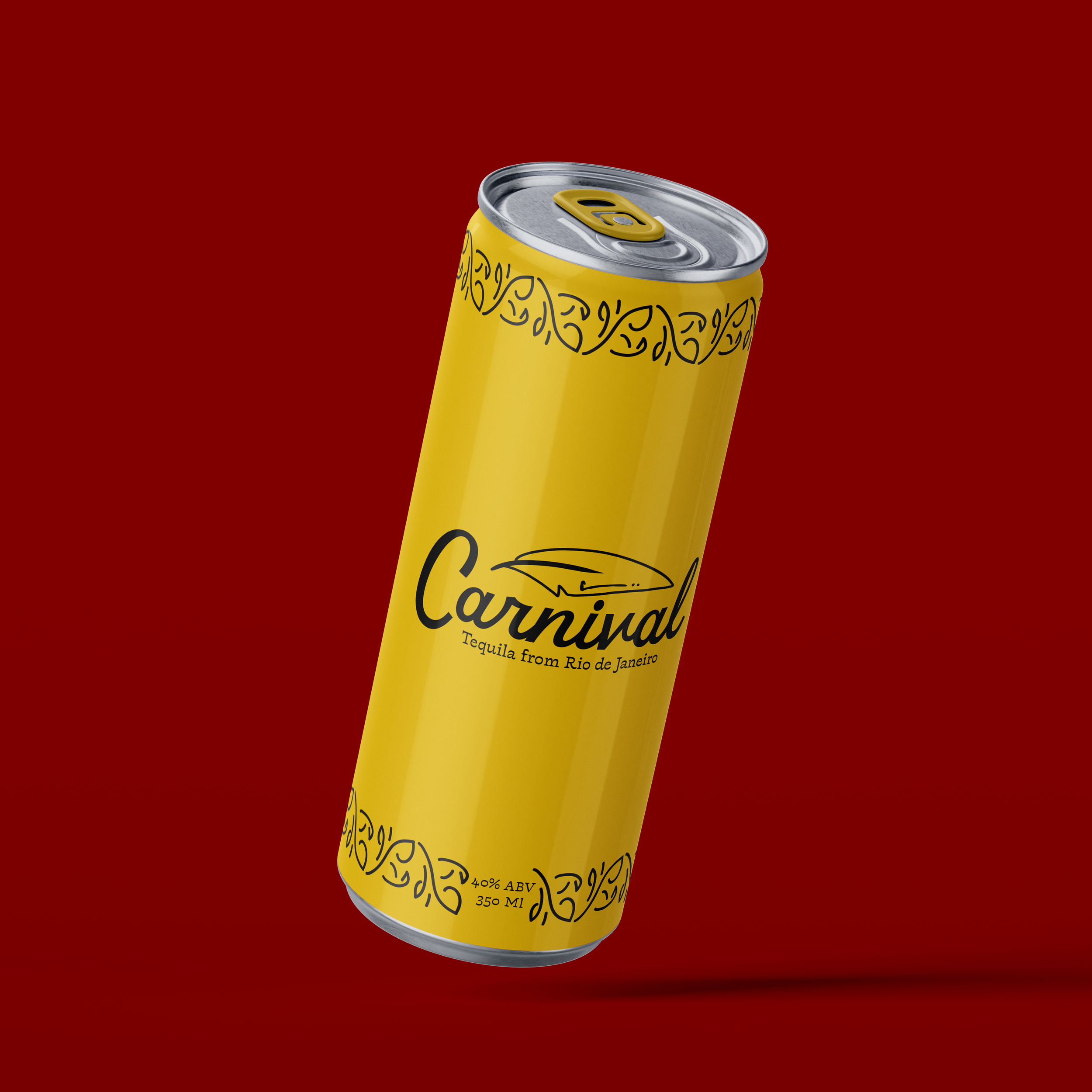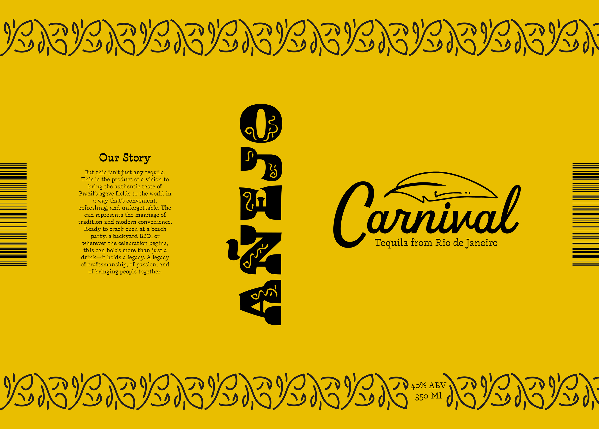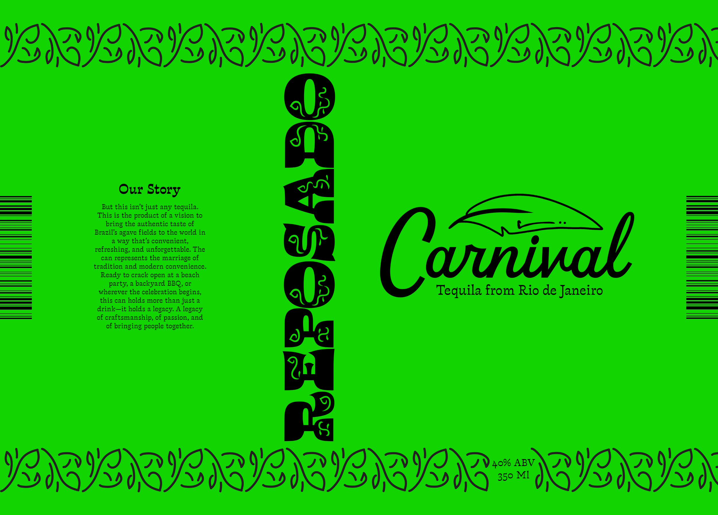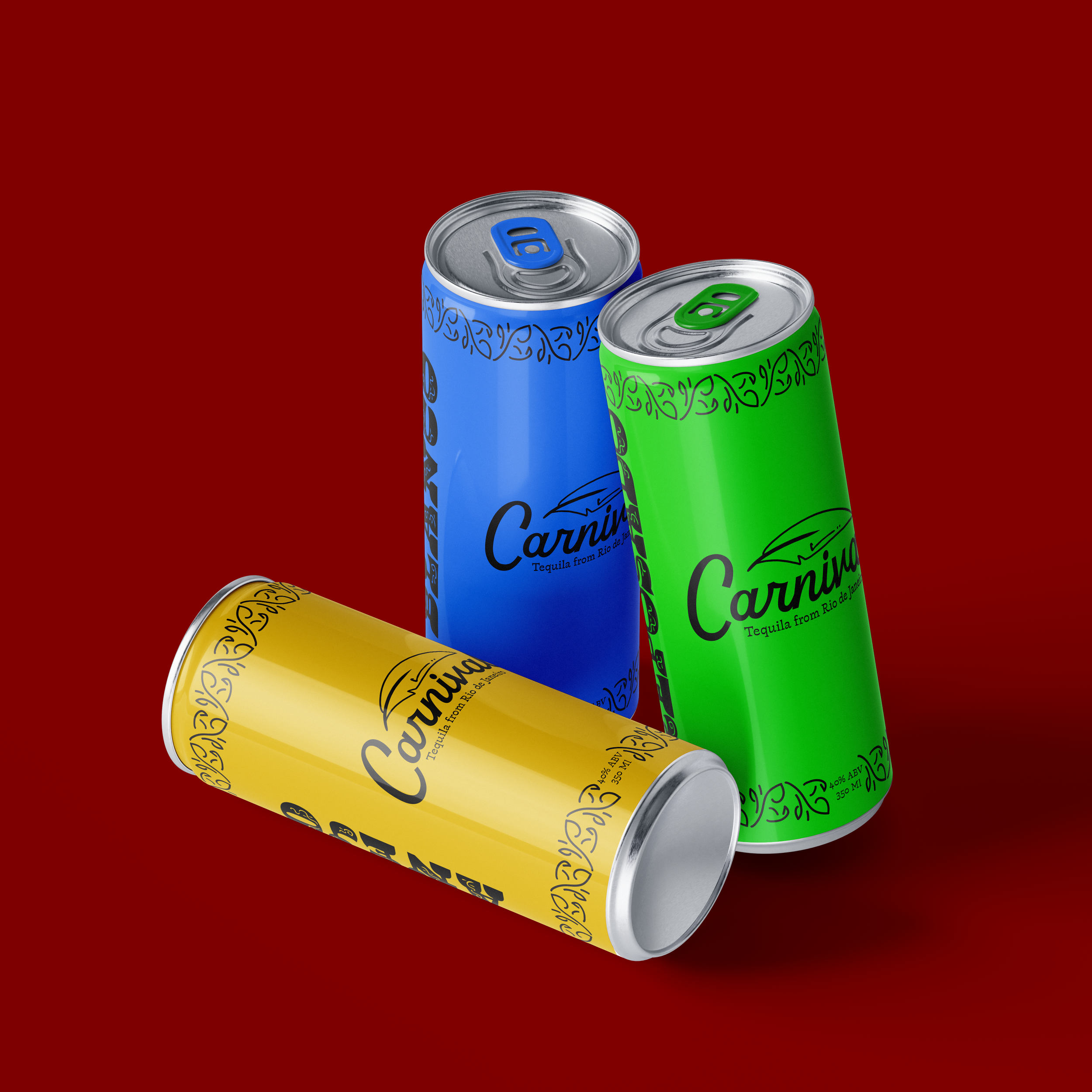 Carnival is a canned tequila brand focused on the aesthetic of the Brazilian festival Carnaval. The colors of the brand are inspired by the blue macaw, and the patterning takes inspiration from the typeface Violeta Jardinera.