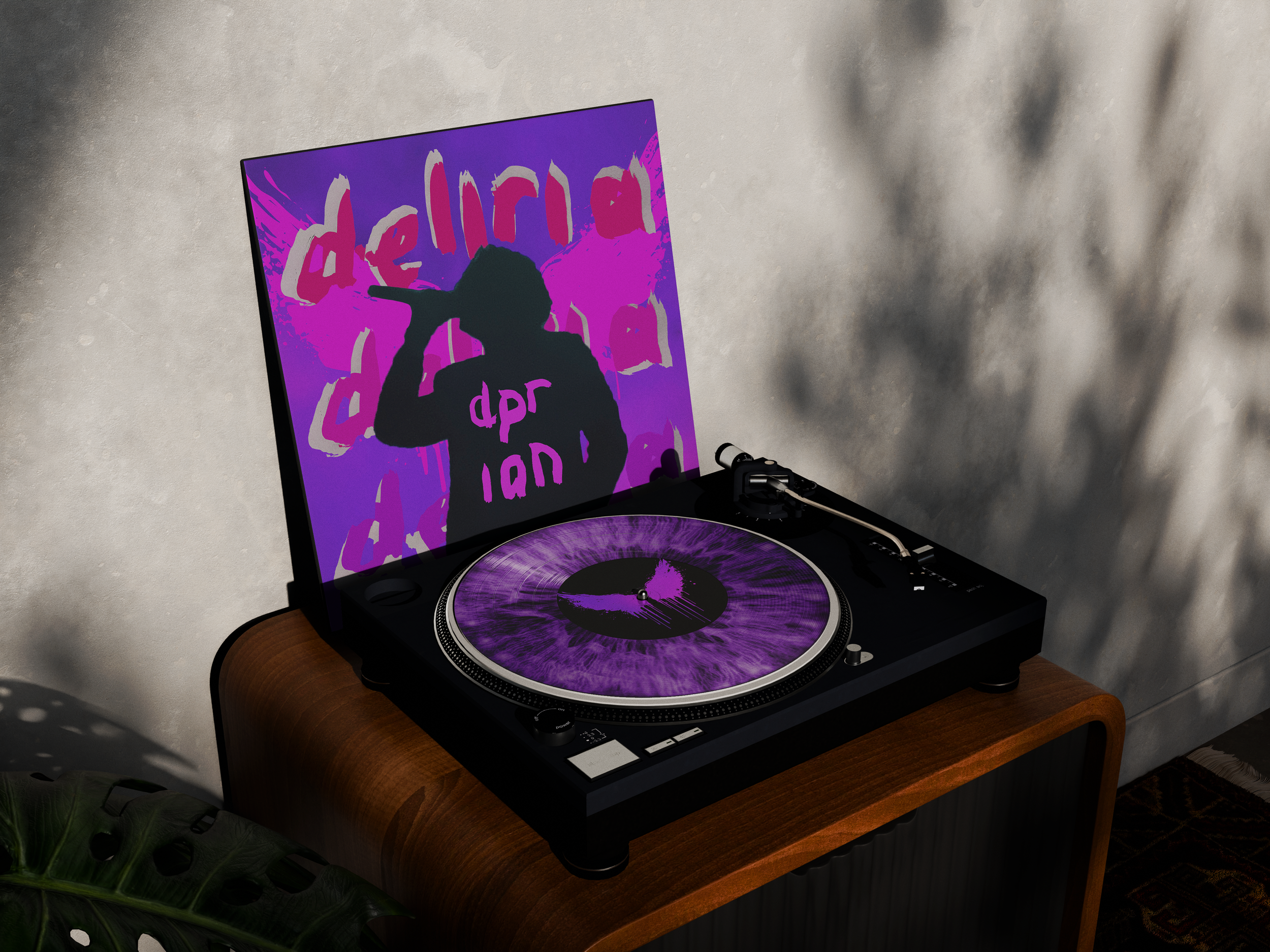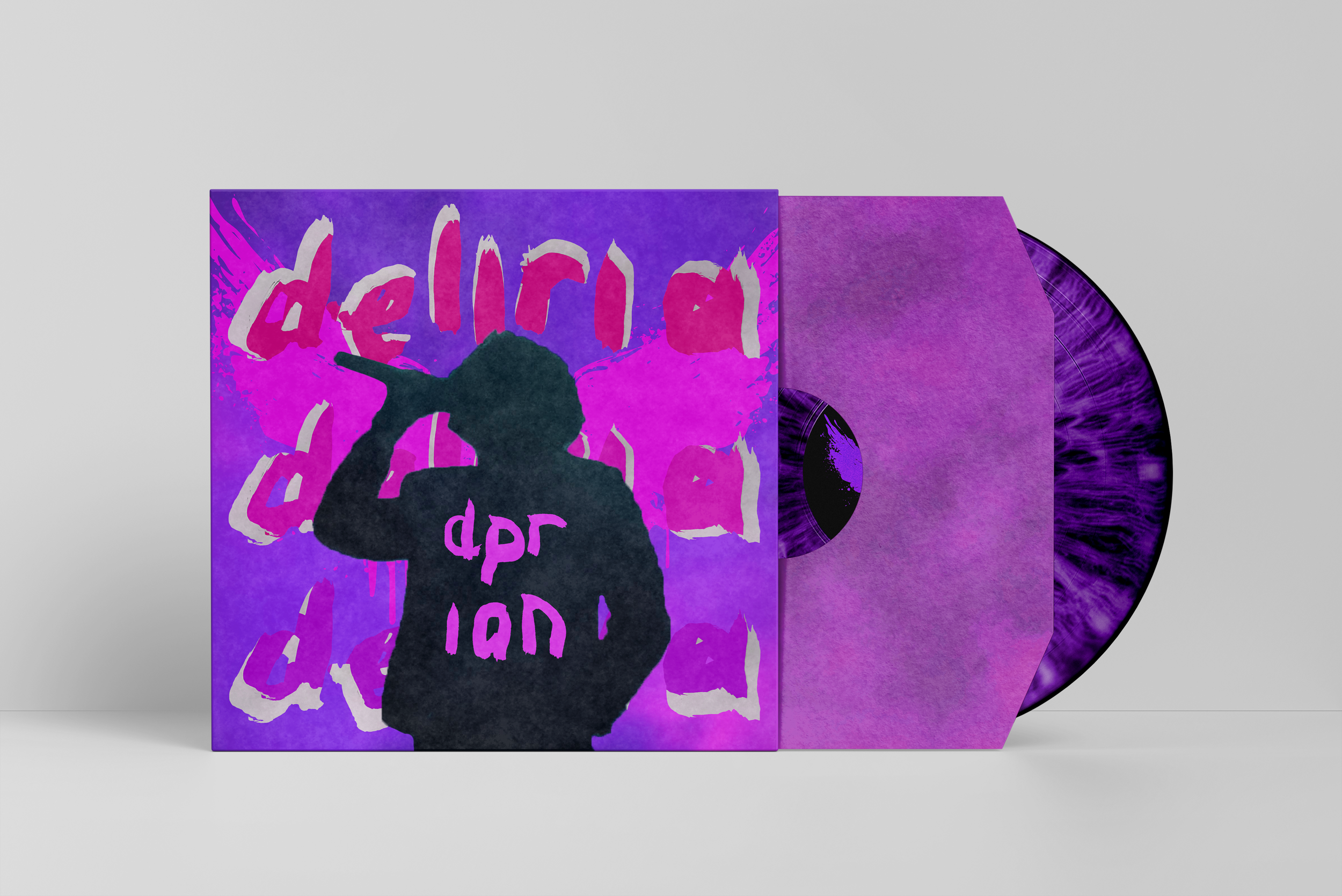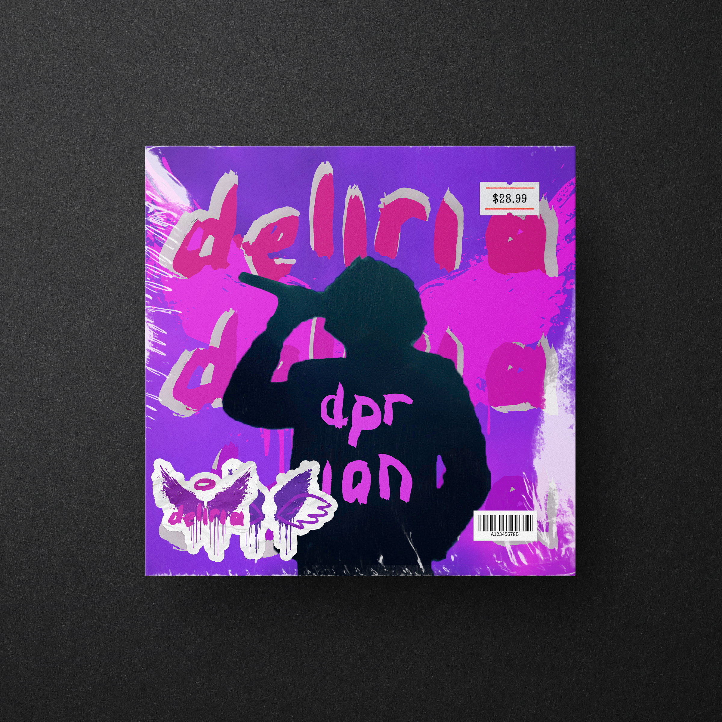 Deliria is a fictionalized album repackage for the artist DPR Ian. It features the angel motif he is known for as well as an iris vinyl, alluding to his previous albums’ CDs. All of the photography was done by me at his tour in 2024, and the majority of the type is hand done as well.