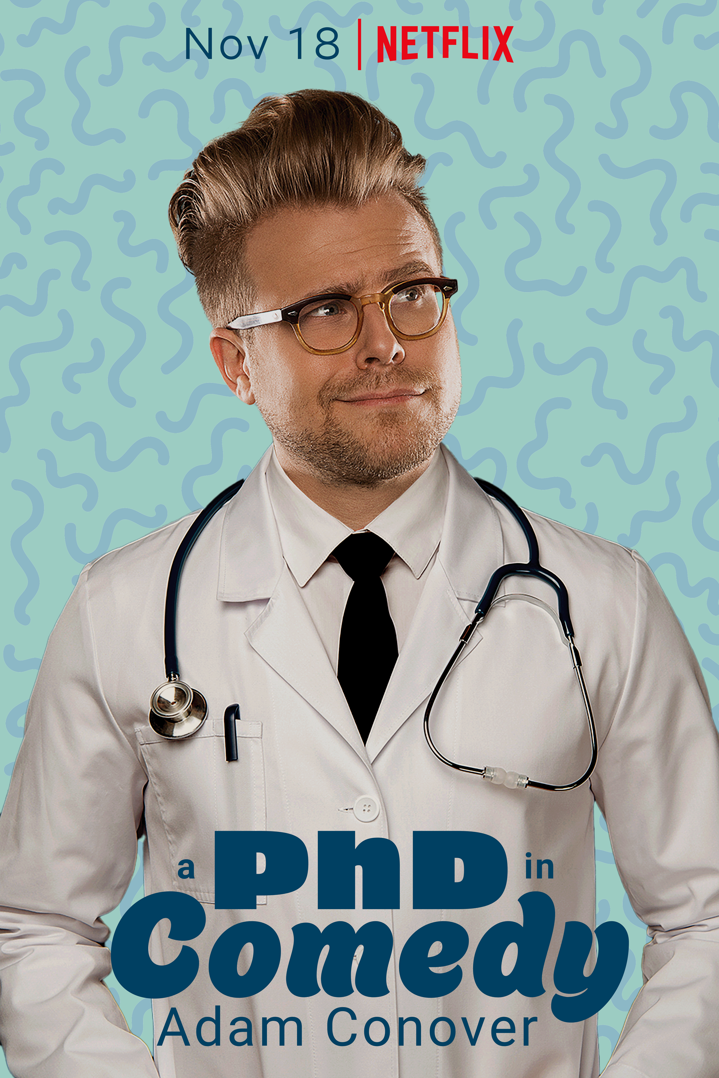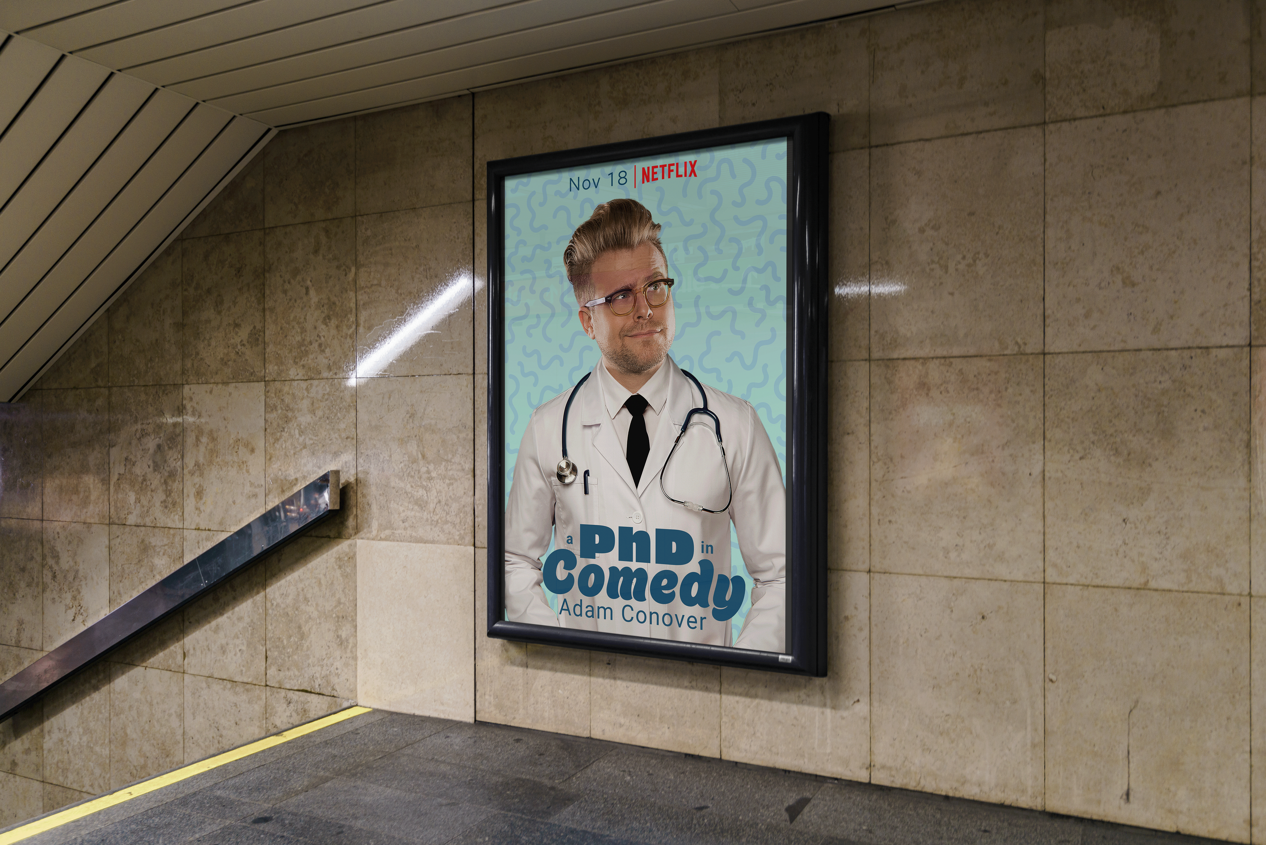 A PhD in Comedy is a fictionalized comedy special for comedian and Internet personality Adam Conover. Playing on the fact that he is the only member of his family without a PhD, A PhD in Comedy is meant to be a humorous stand-up set hosted on the Netflix streaming service. The key images was created with images from Adobe Stock and and free use image of Adam himself. The Netflix UI was provided through Figma.